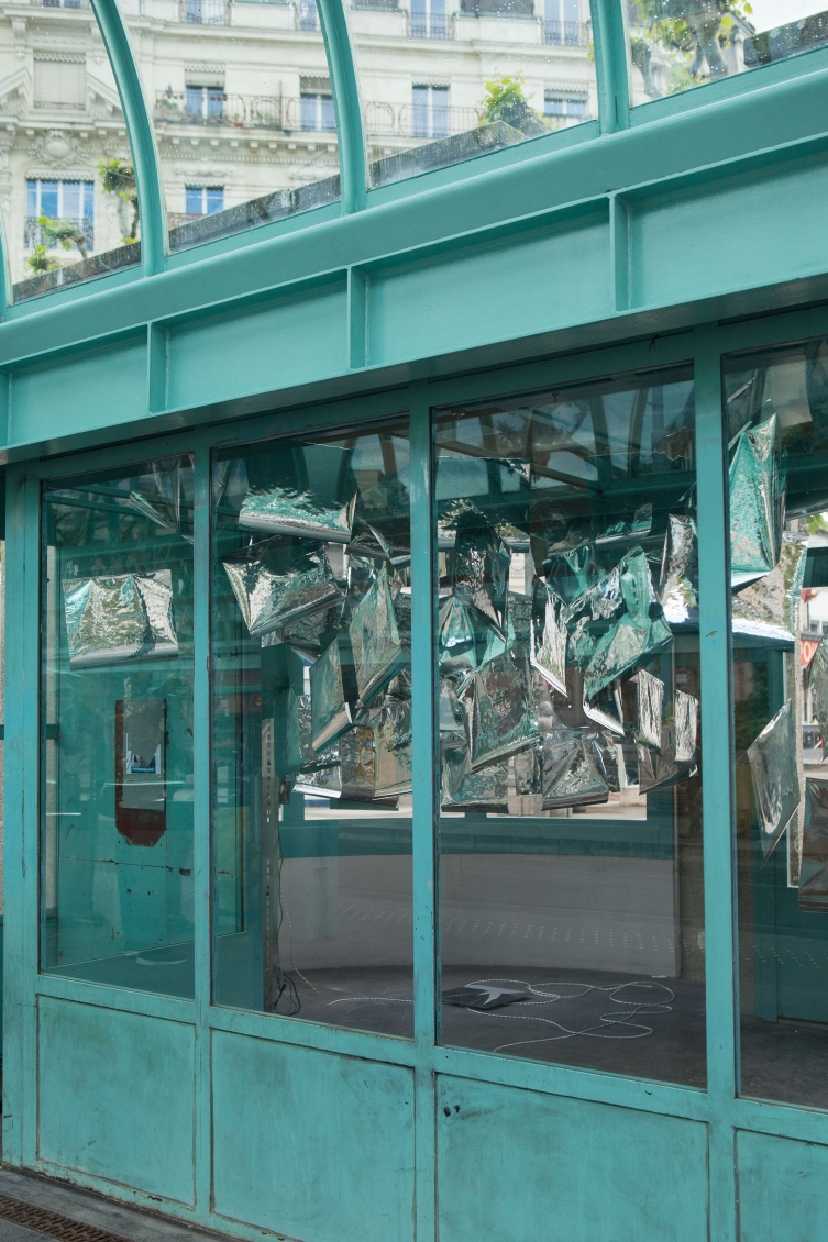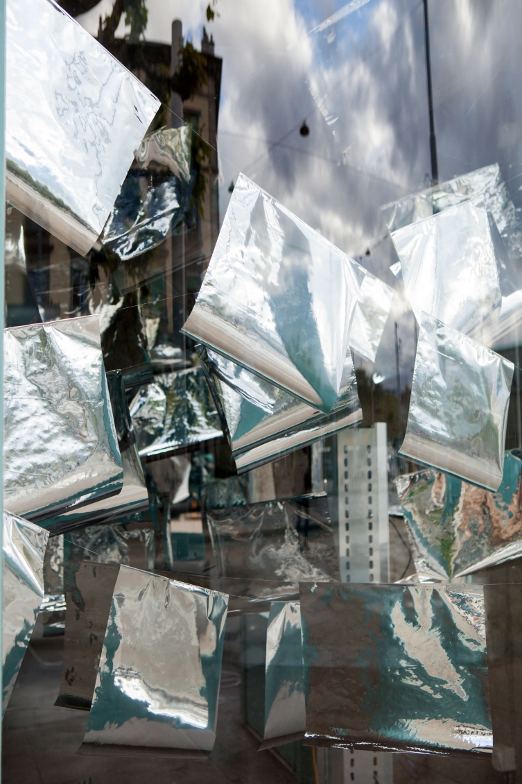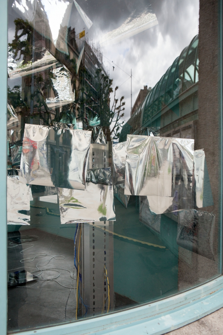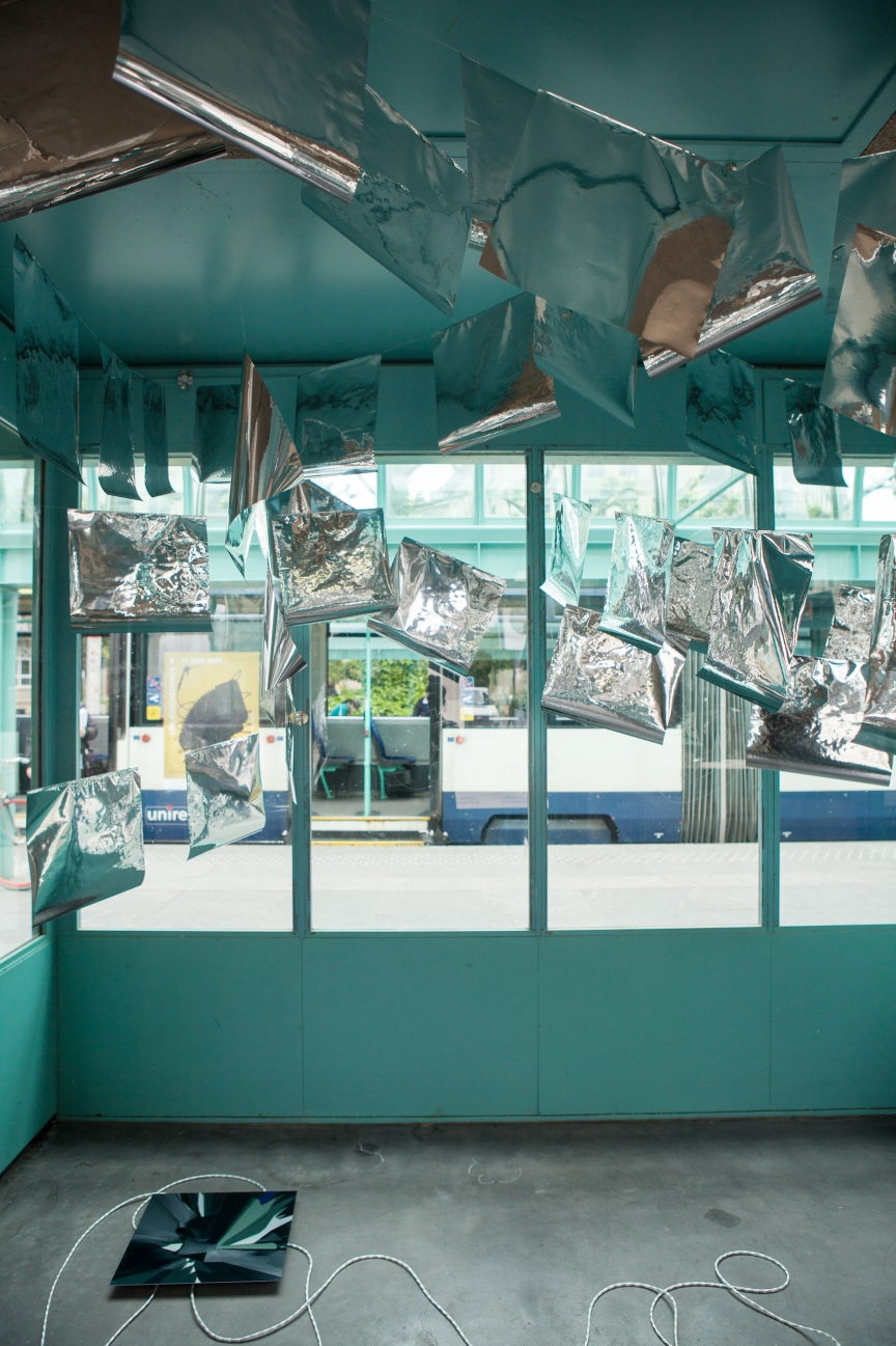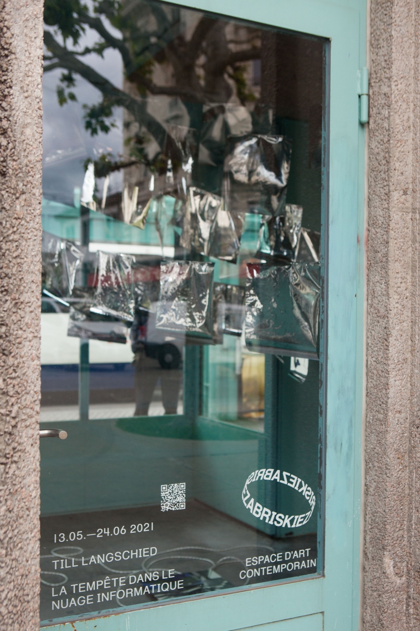 * For his solo exhibition "La tempête dans le nuage informatique" Till Langschied expands the installation of silver flags from his work Datapotheosis (2020) to fill the entire space of Zabriskie Point. The flags are reminiscent of Tibetan prayer flags, which send out blessings when moved by the wind. The artist draws a parallel between this religious function and the quasi-spiritual character of data traffic and uploads into an invisible ‘cloud‘. As such an entangled cloud the flags in the exhibition space can be seen as units in a server farm, enduring a constant storm of electronic impulses rushing through them.