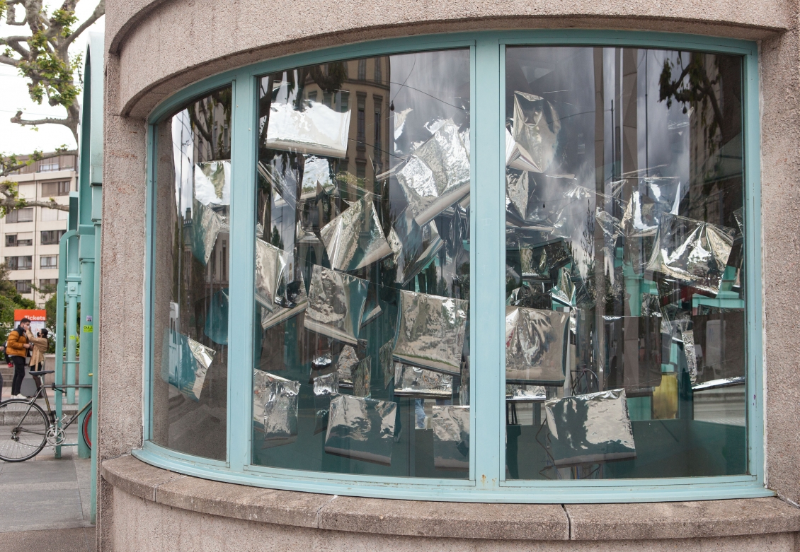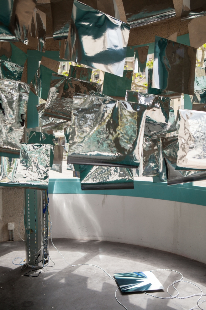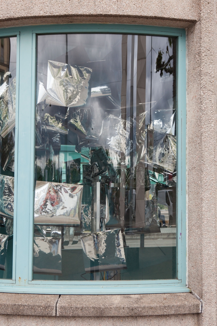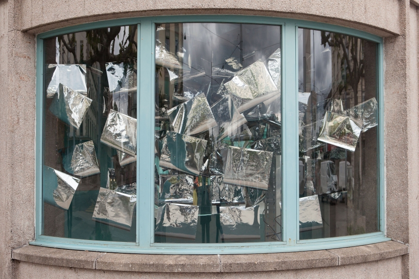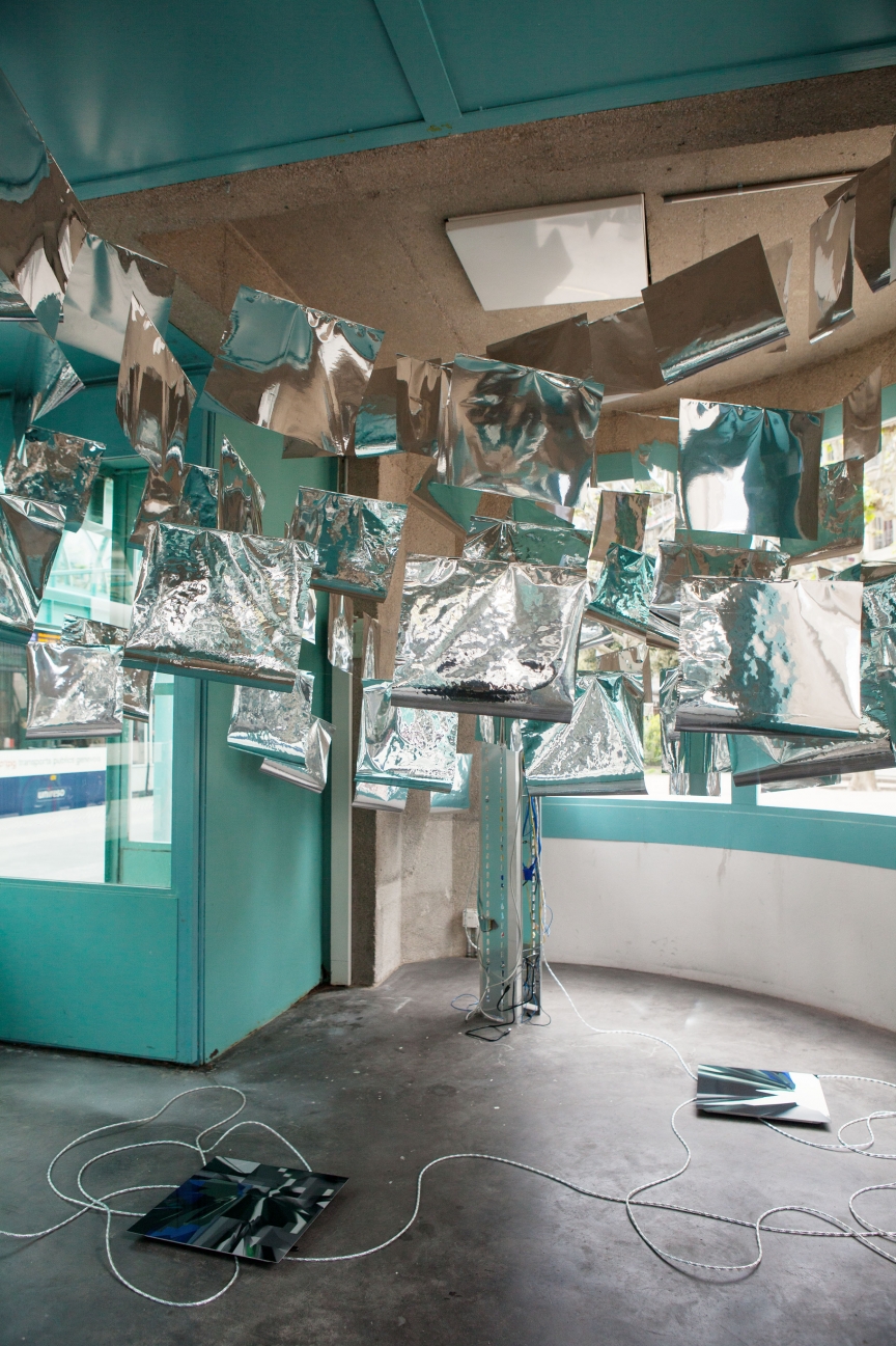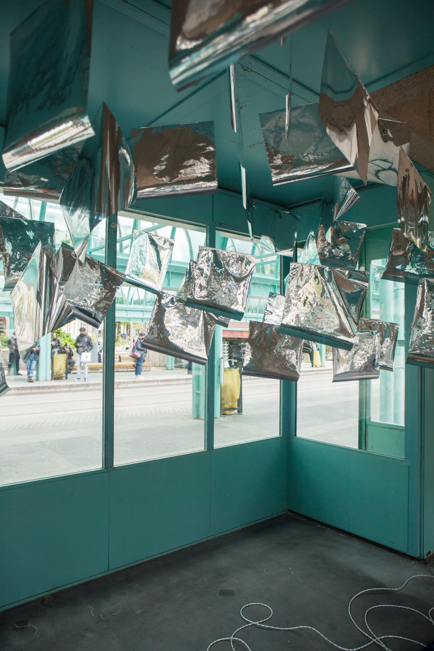* For his solo exhibition "La tempête dans le nuage informatique" Till Langschied expands the installation of silver flags from his work Datapotheosis (2020) to fill the entire space of Zabriskie Point. The flags are reminiscent of Tibetan prayer flags, which send out blessings when moved by the wind. The artist draws a parallel between this religious function and the quasi-spiritual character of data traffic and uploads into an invisible ‘cloud‘. As such an entangled cloud the flags in the exhibition space can be seen as units in a server farm, enduring a constant storm of electronic impulses rushing through them.