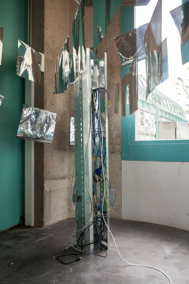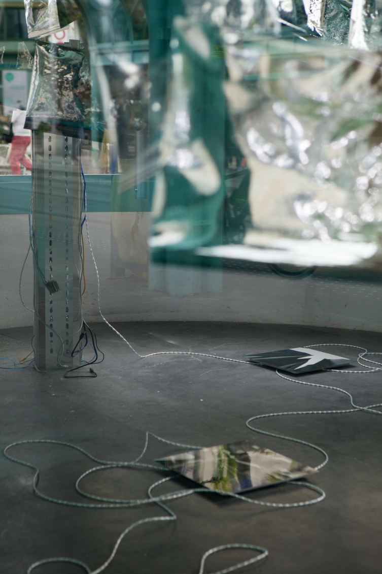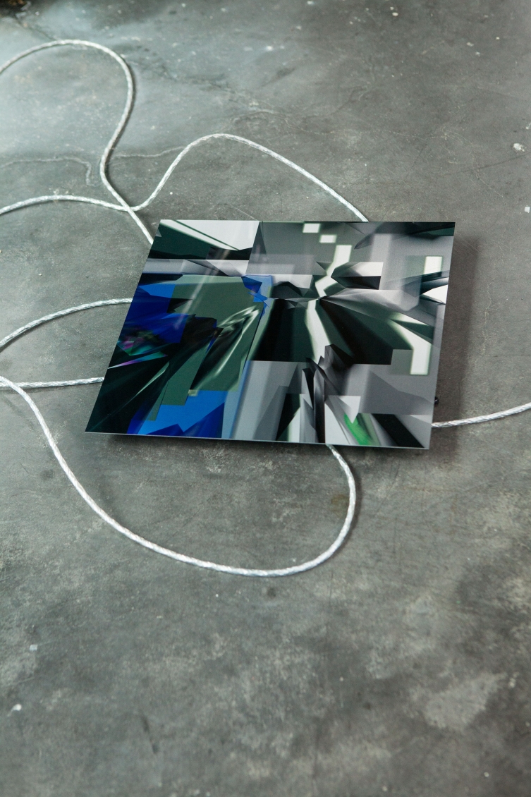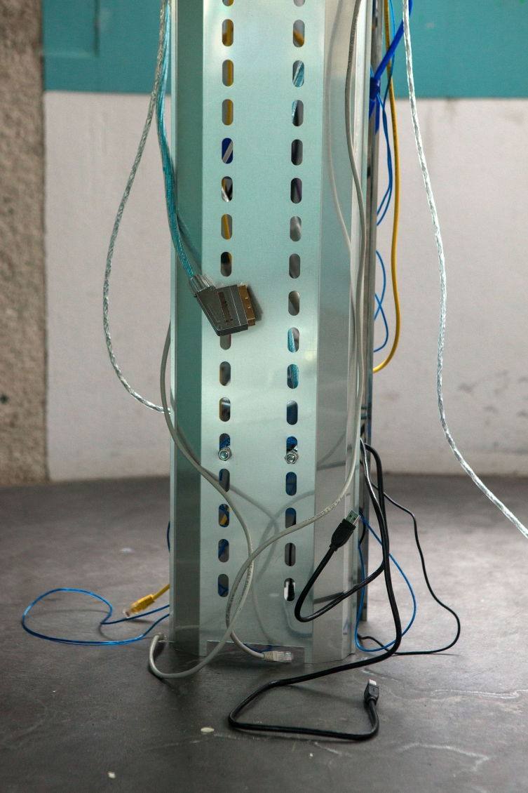 In opposition to the cloud of flags Langschied places a messy network of cables on the floor which connects two central towers with a series of aluminum prints that function as portals into a digital reality. The glitched images indicate that this digital reality is generally way more chaotic than the titans of the internet want to make us to believe.