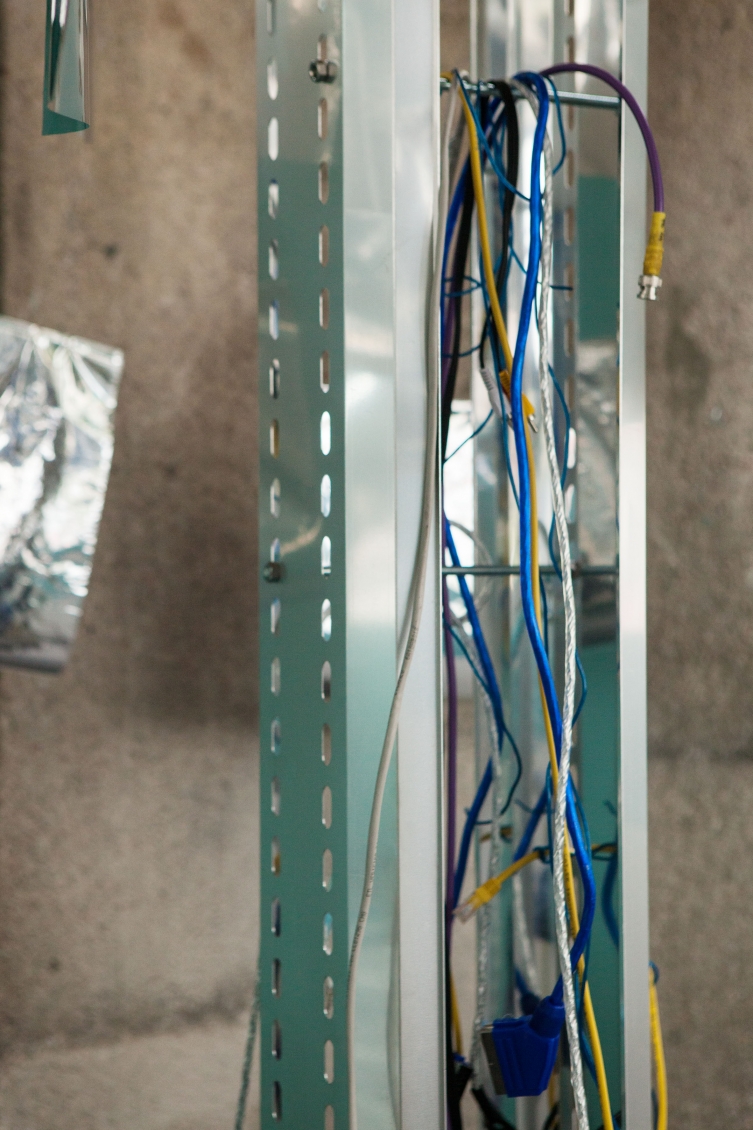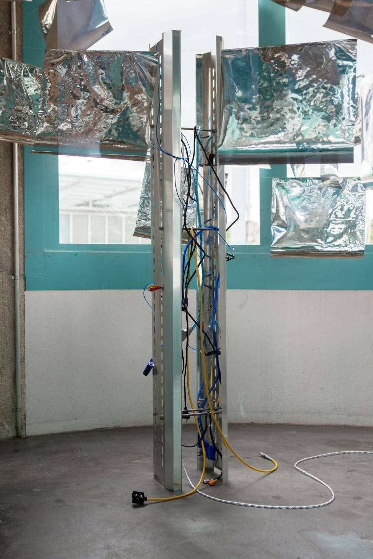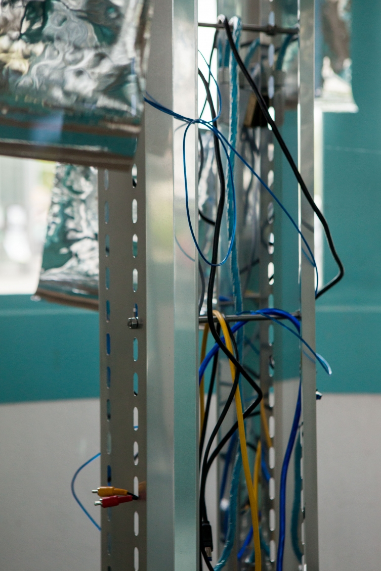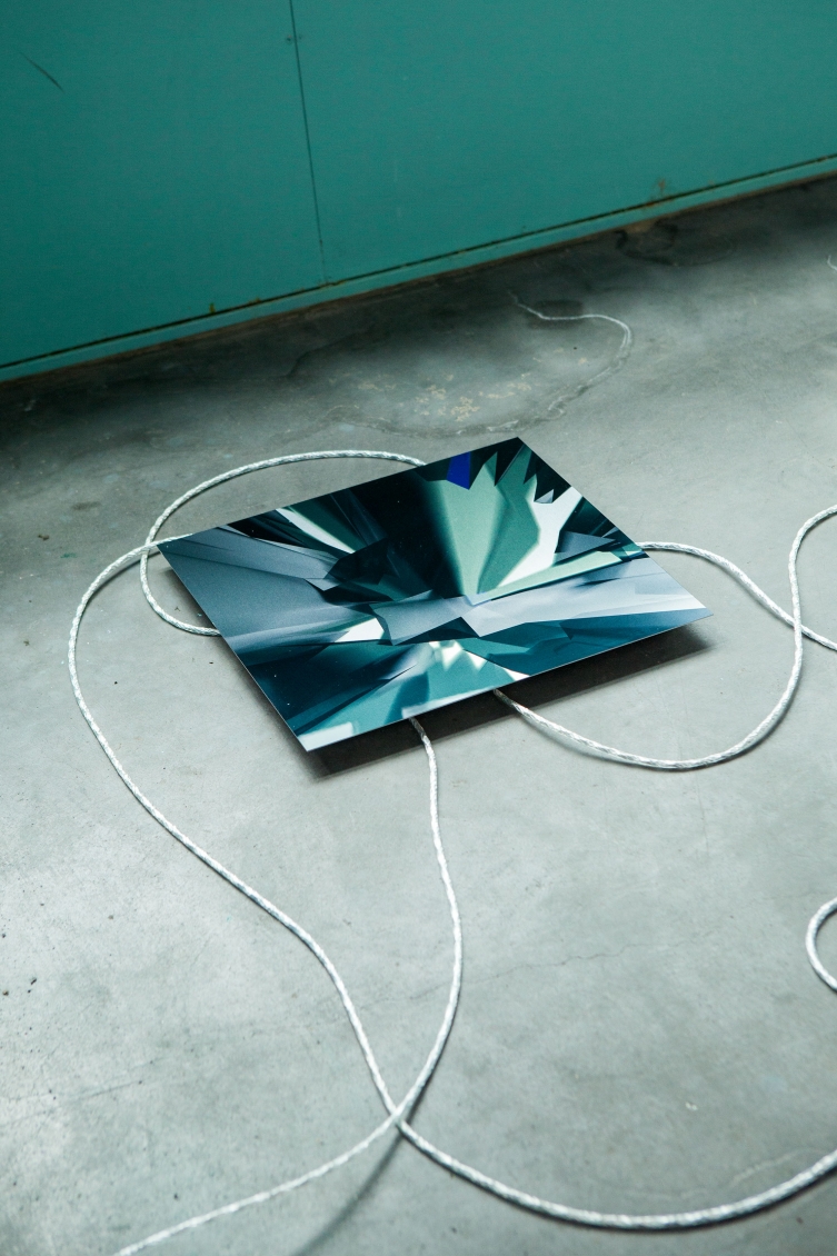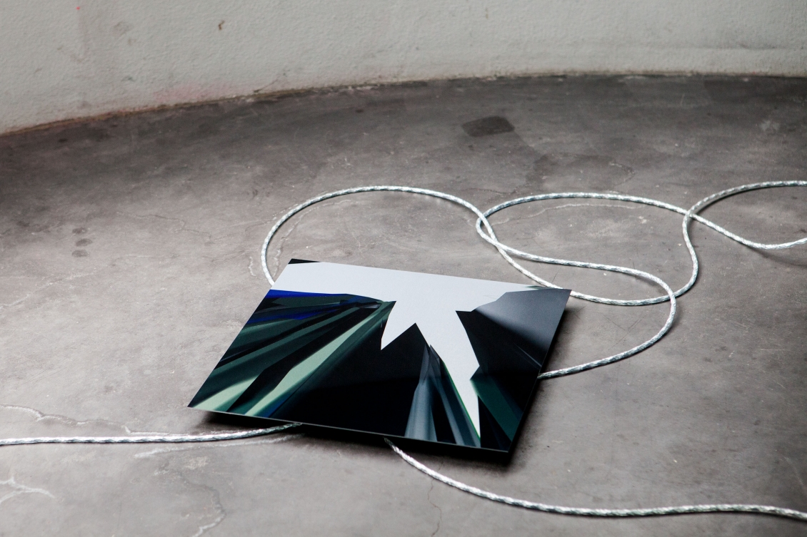 In opposition to the cloud of flags Langschied places a messy network of cables on the floor which connects two central towers with a series of aluminum prints that function as portals into a digital reality. The glitched images indicate that this digital reality is generally way more chaotic than the titans of the internet want to make us to believe.
