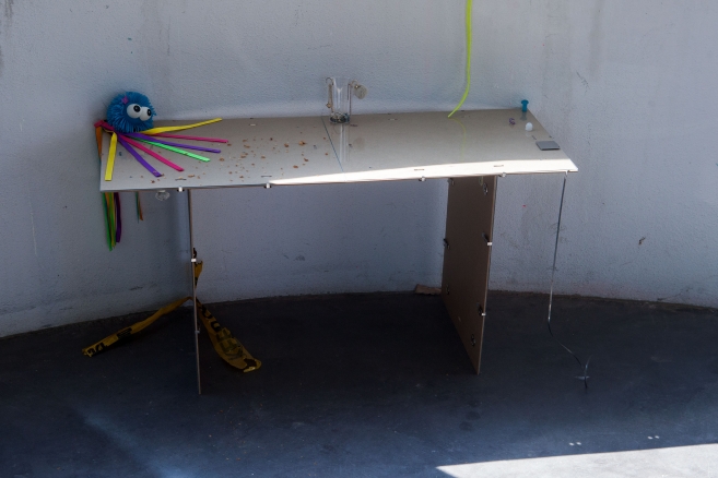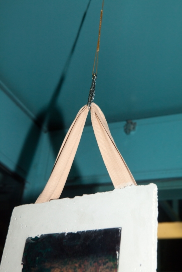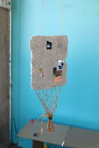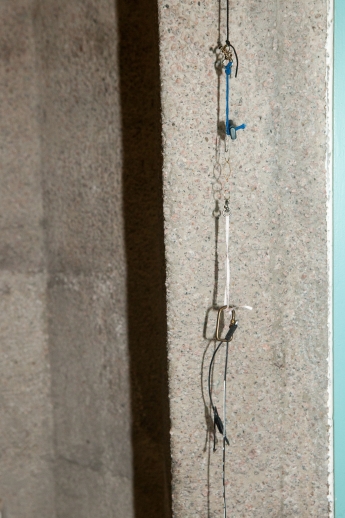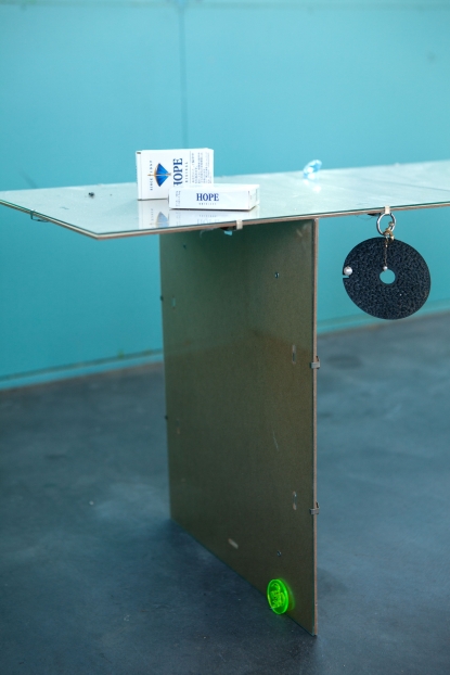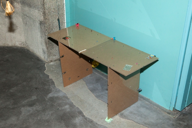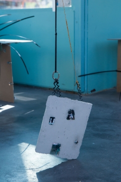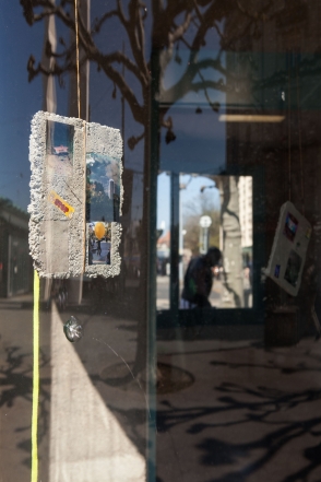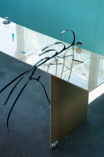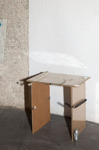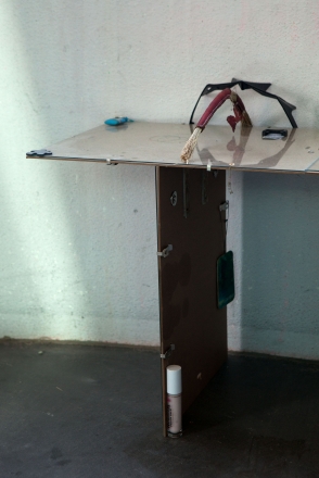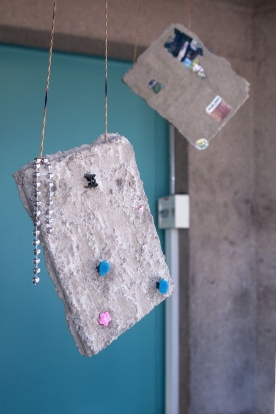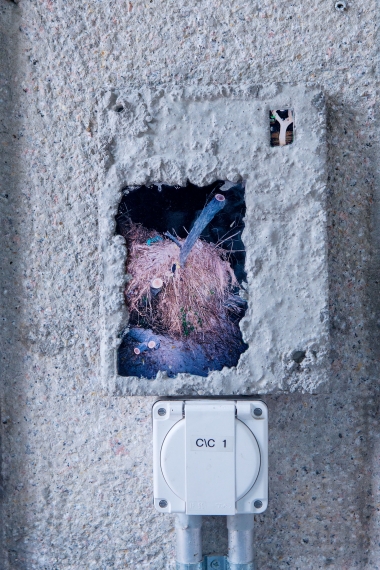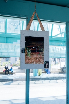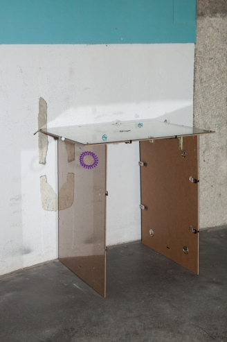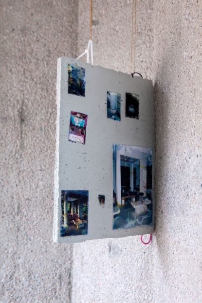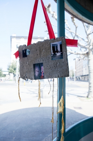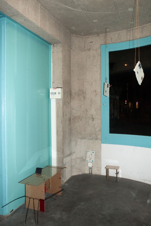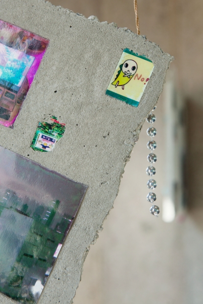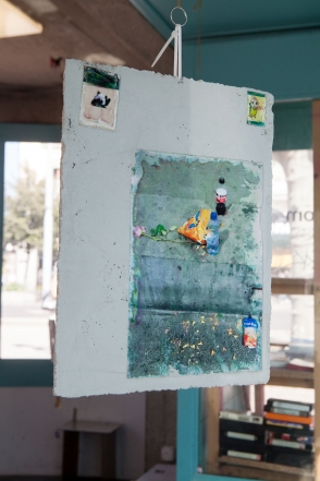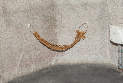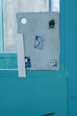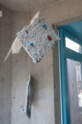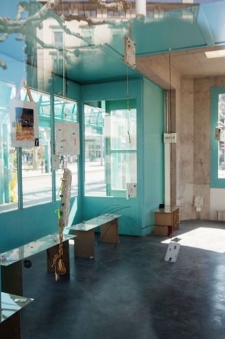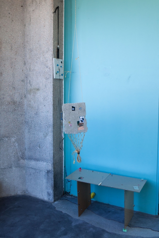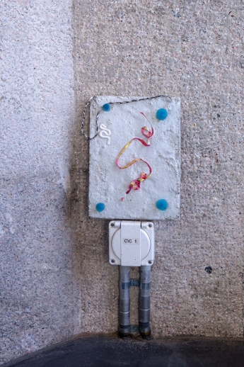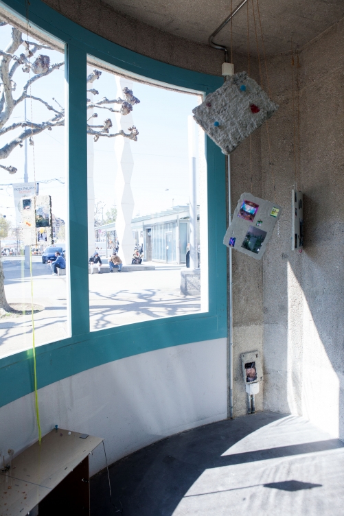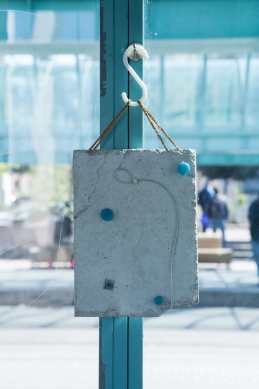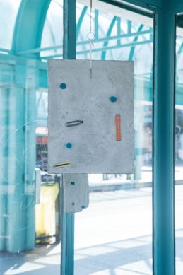The linear metal vaults, each with a small semicircular room attached, run parallel to the tram platform. They are positioned in such a way that we can circulate fluidly around them. The building envelope of sandblasted concrete and curved glass panes separates the public space from the art space. The porosity of the material provides a base for adhesion, and in the glass one recognises its distorted image. The objects exhibited inside become part of the space. The glass panes of the picture frames, which are placed along the walls in the form of a bench, reflect the immediate environment. The concrete slabs, charged with artefacts of public space, blur with the walls. Detached from the context, I see in these found objects mass-produced items that have been casually consumed and later discarded. Things that are hardly missed, that are almost made to be lost. Souvenirs of a controlled consumer behaviour. The bench as a symbol of designed public space seems very fragile, probably not usable as such. This furniture that tells you, here you have to wait, here you have to meet and stay, here you have to enjoy the view.