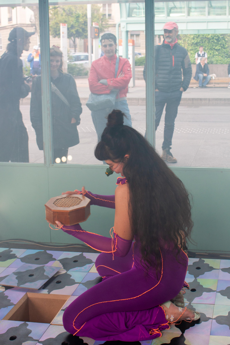Au centre de l’espace de Zabriskie, une série de boîtes forment un rectangle surélevé. Les couvercles des boîtes peintes renvoient à un sol dallé, dont les motifs sont inspirés par les visions troubles provoquées par les migraines. Ces multiples boîtes constituent une mosaïque emplie de secrets, des objets appartenant à des lieux différents, en partie dévoilés durant la performance. Certains sont des trésors cachés, tandis que d'autres sont peut-être maudits.