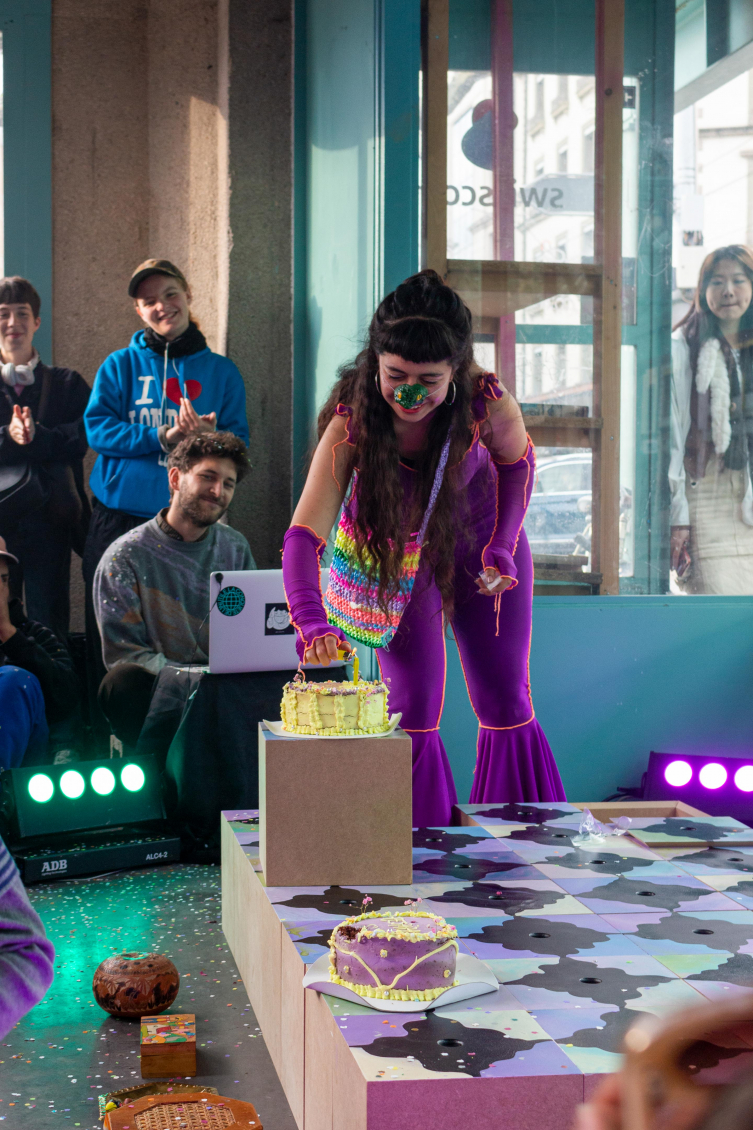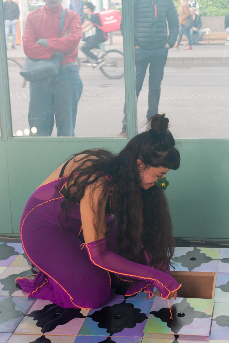 Cette multitude de réceptacles donne lieu à un spectacle. Lors du vernissage, Maria Fernanda propose une performance dans laquelle elle incarne un clown. Mais pas celui qu’on a pour habitude de voir. Celui-ci vient du Sud, de l’autre côté de l’océan Atlantique. Il vacille sur ce sol surélevé de l’espace de Zabriskie. Il est ridiculisé, mais raconte pourtant la vérité. Par ses trébuchements, il symbolise la démarche instable des migrantexs, qui vacillent et se rattrapent de justesse. Cette instabilité renvoie à la difficulté des chemins de la migration, à ces moments de pertes de repères et de sentiment d’appartenance. Le sol dallé symbolise à la fois cette précarité et cette violence, mais aussi la réconciliation avec le passé et le présent. La précarité devient ici ressource.
