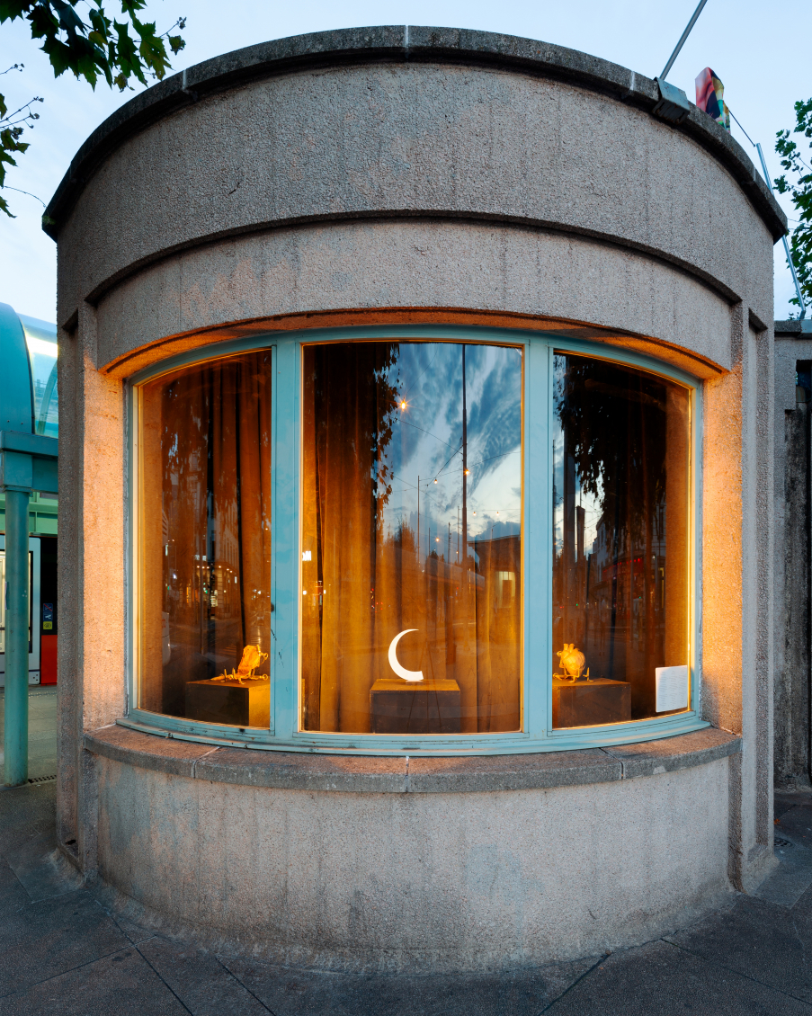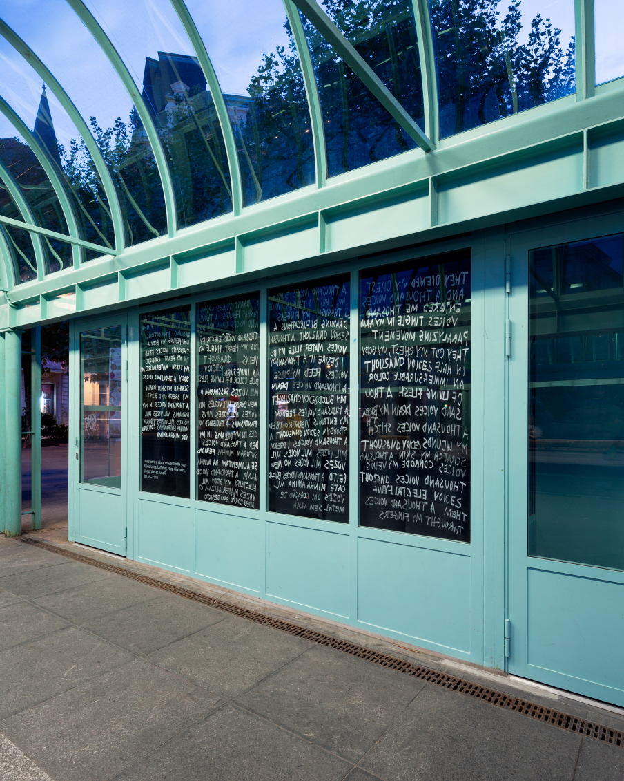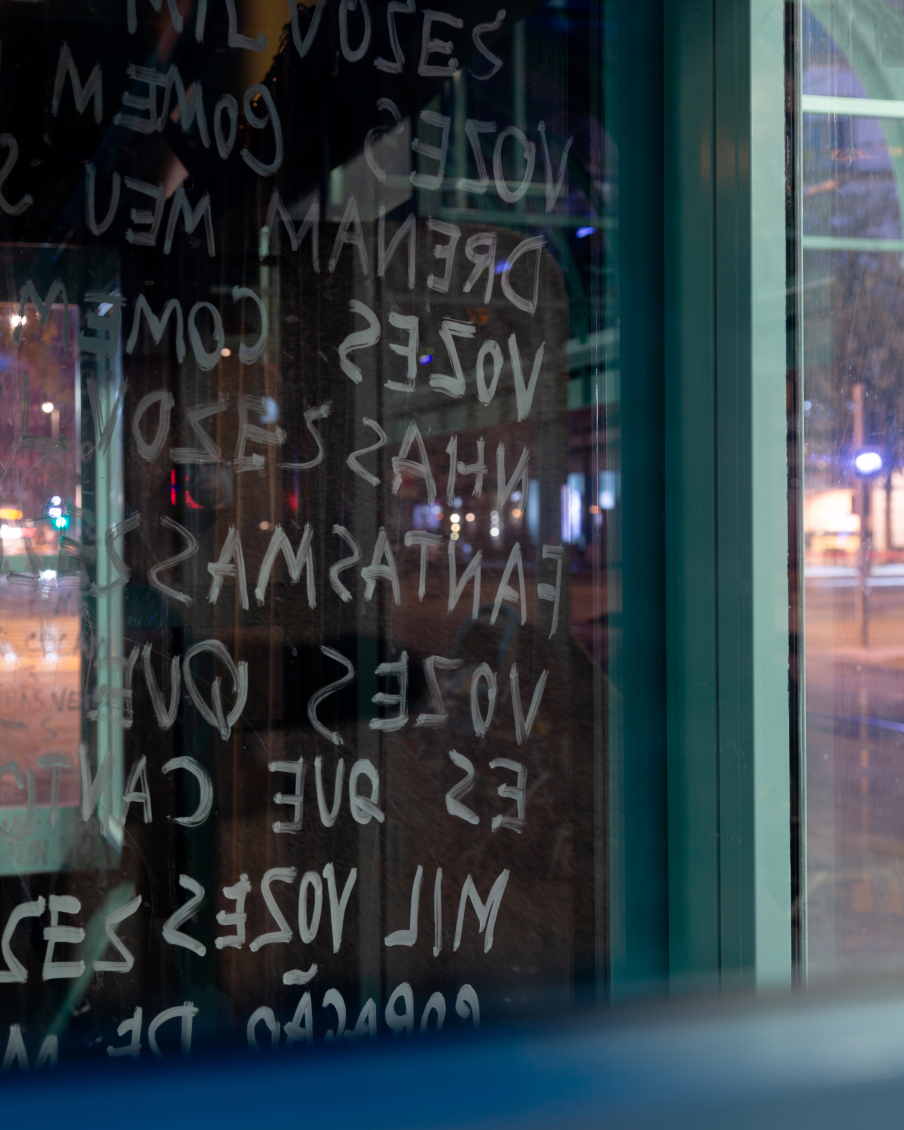 Au seuil du monde extérieur, Xénia Lucie Laffely imagine un rêve cauchemardesque dans une bannière suspendue au-dessus de la porte. La vision fugace dépeinte à travers son oeuvre « Pigeon Fish » est tiré d'un monde aux couleurs charnues, soumis à des relations inter-espèces - le maillage translucide d'une réalité répartie d'amants humains, de pigeons hantant les balcons et de poissons rôdant à l'abri aquatique. Leurs corps s'entremêlent, leurs visages cousus et égouttés se rattachent au tissu, dévoilant de nouvelles possibilités d'assemblage et de fusion dans un avenir hybride.