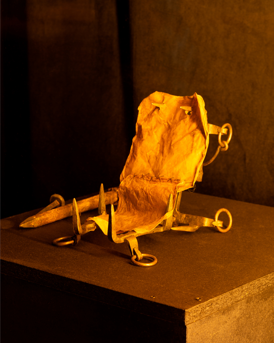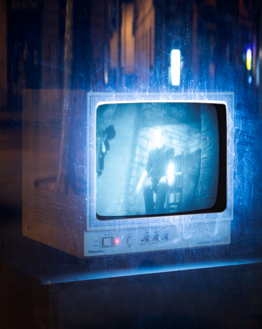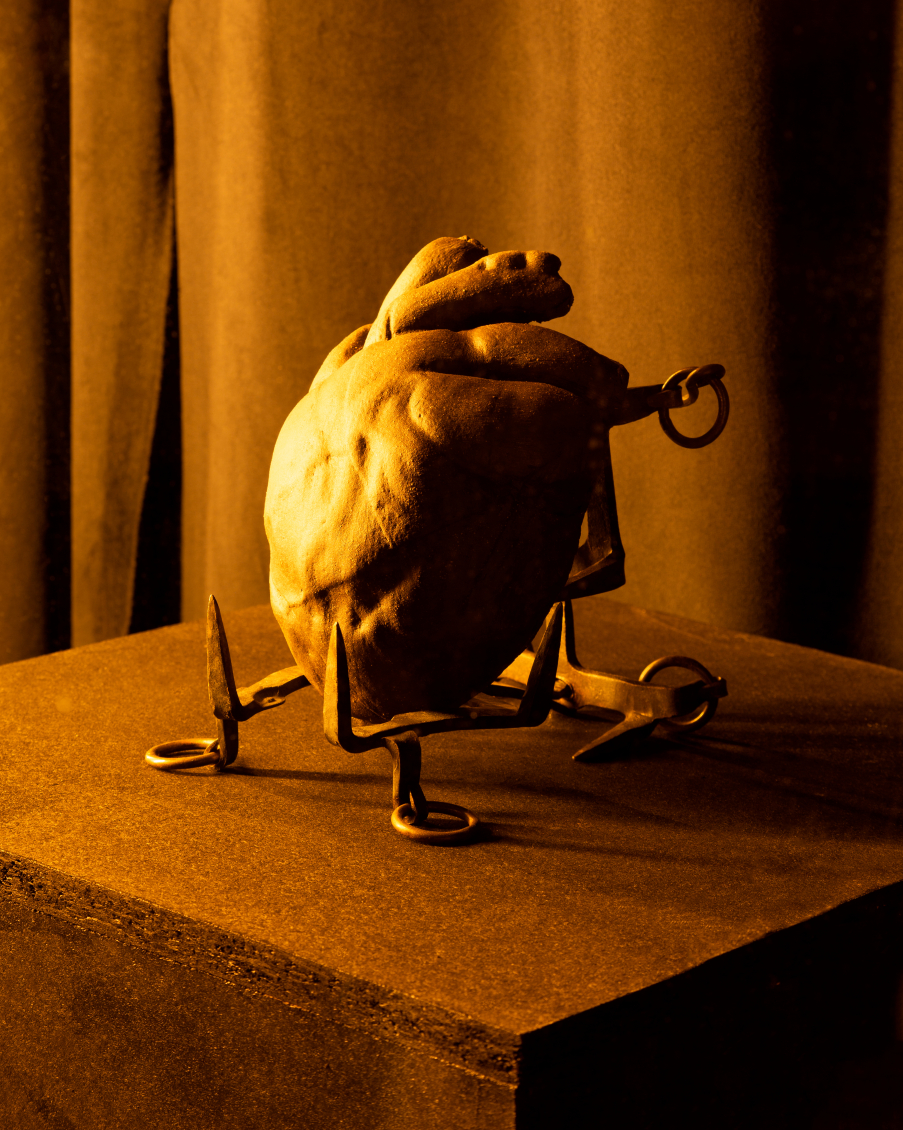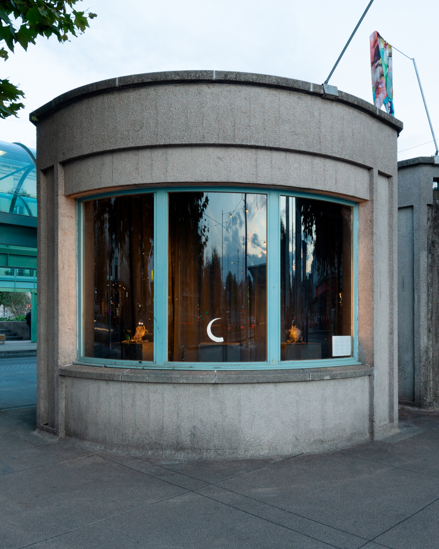 Au seuil du monde extérieur, Xénia Lucie Laffely imagine un rêve cauchemardesque dans une bannière suspendue au-dessus de la porte. La vision fugace dépeinte à travers son oeuvre « Pigeon Fish » est tiré d'un monde aux couleurs charnues, soumis à des relations inter-espèces - le maillage translucide d'une réalité répartie d'amants humains, de pigeons hantant les balcons et de poissons rôdant à l'abri aquatique. Leurs corps s'entremêlent, leurs visages cousus et égouttés se rattachent au tissu, dévoilant de nouvelles possibilités d'assemblage et de fusion dans un avenir hybride.