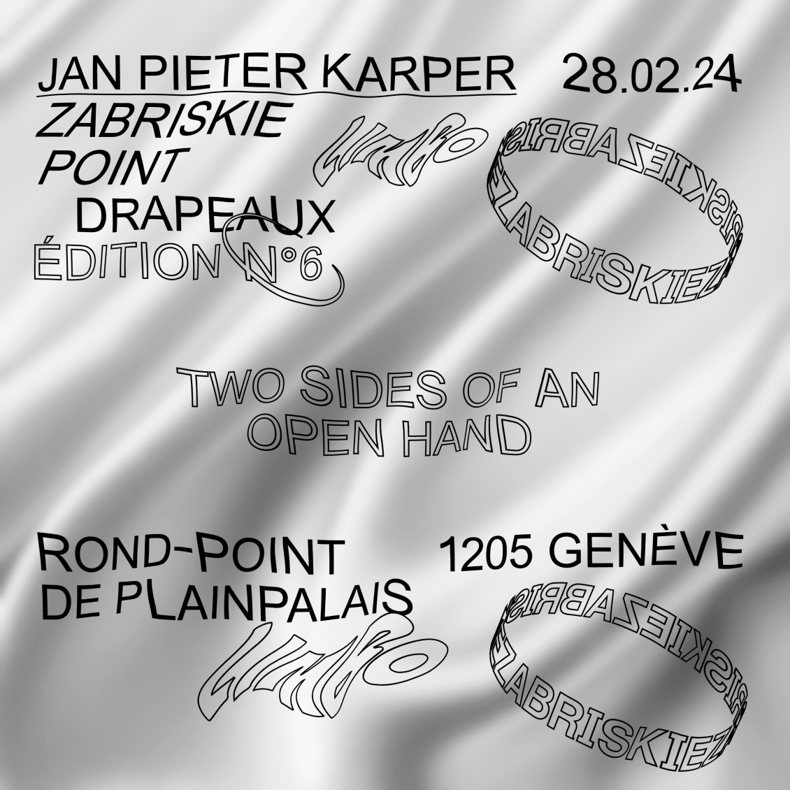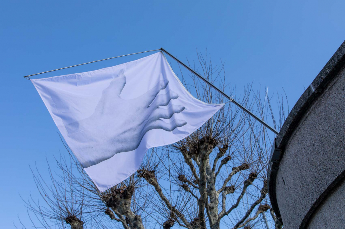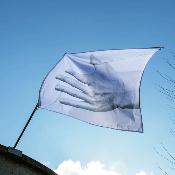 Jan-Pieter est le troisième artiste de la chaîne d’invitation, il vit et travaille à Amsterdam et a été invité par Andrea Salerno. Jan-Pieter a choisit de travailler sur la représentation photographique d’une main ouverte, qu’il nous montre vue de l’intérieur sur un drapeau, puis de l’extérieur sur le deuxième. Grâce aux deux faces de chaque drapeaux, la photographie d’une main se transforme en une séquence spatiale de quatre images qui semblent interagir les unes avec les autres à la guise des intempéries.