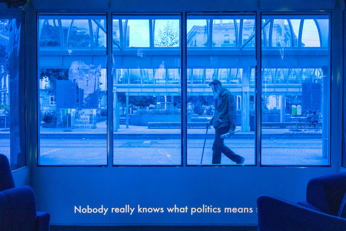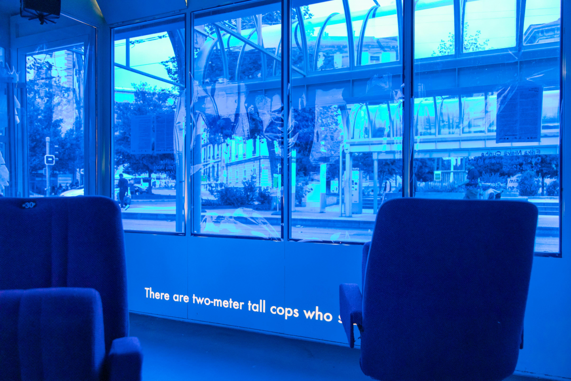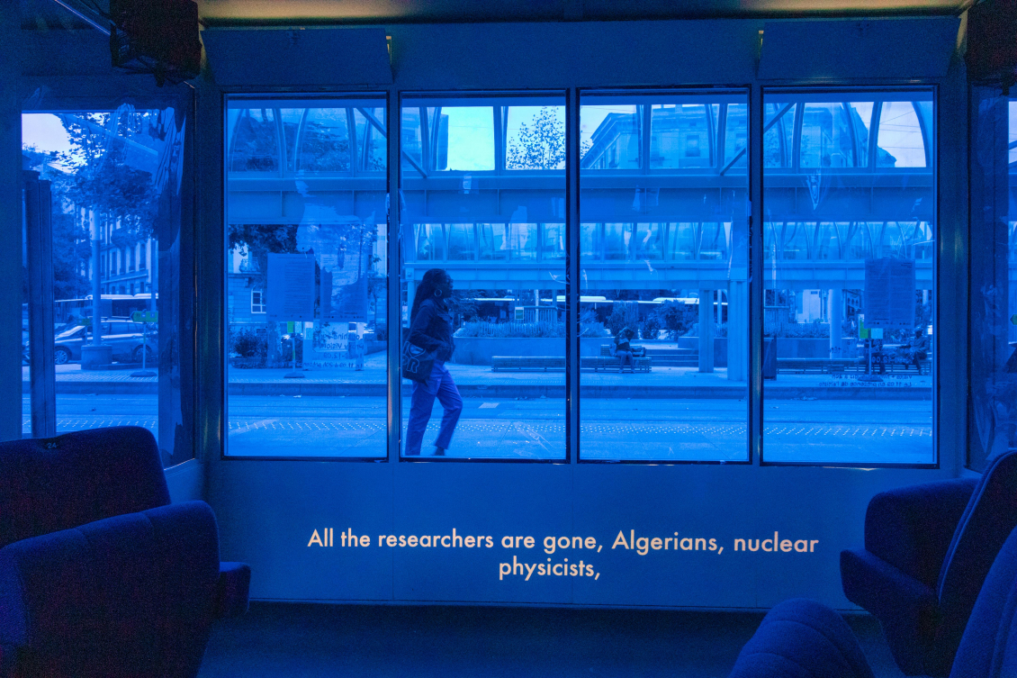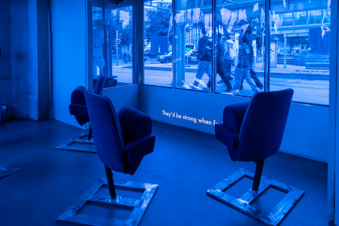 Le noir de l’écran n’est pas un noir : le cadre est rompu, il n’y a pas d’image. L’écran devient toutes les surfaces qui nous entourent, visibles depuis nos sièges rotatifs. Aucun flux visuel, aucune représentation directe de la violence ou du réel : seulement des sous-titres en anglais. L’œuvre rompt ainsi avec la frontalité à laquelle nous sommes habitué.e.x.s au cinéma pour proposer une expérience sensorielle et politique, fondée sur une écoute attentive et incarnée.
