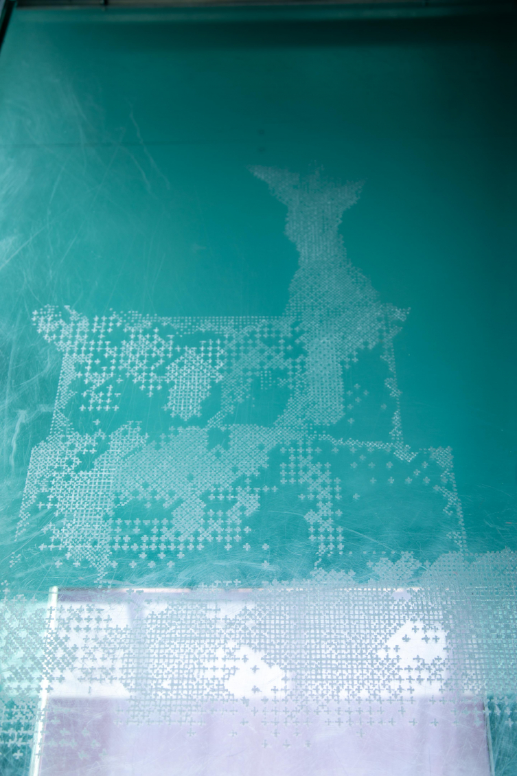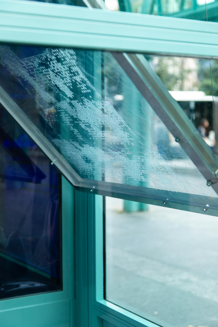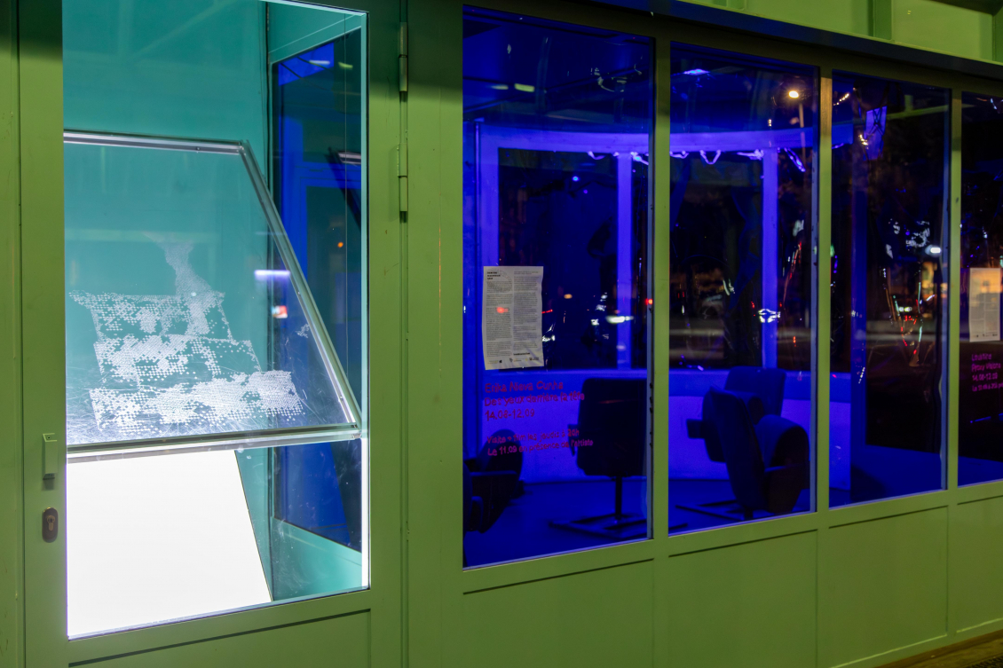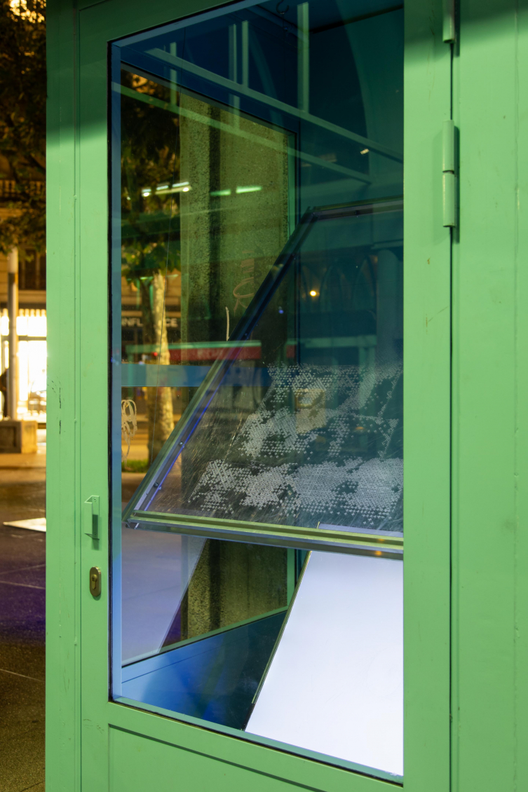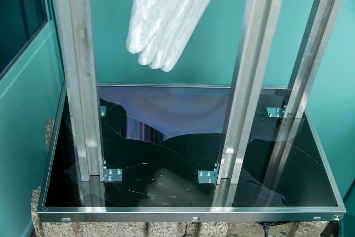 Placée en vis-à-vis de Big Chunk, Buz Variation IV joue de sa lumière à l’intérieur de la cabine et renvoie la lumière d’un écran, posé au sol, sur notre visage comme une hallucination, nous rappelant l’écran d’ordinateur que l’on regarde toute la journée et qui nous empêche de voir le monde réel par la fenêtre, nous donnant l’illusion d’y être connecté·e·x·s. Le plexiglas gravé à la main porte une image pixelisée, fruit d’une création numérique. Cette image, générée par une intelligence artificielle entraînée par Loukhine, représente les socles vides de monuments que l’on rencontre dans des paysages abandonnés ou détruits.