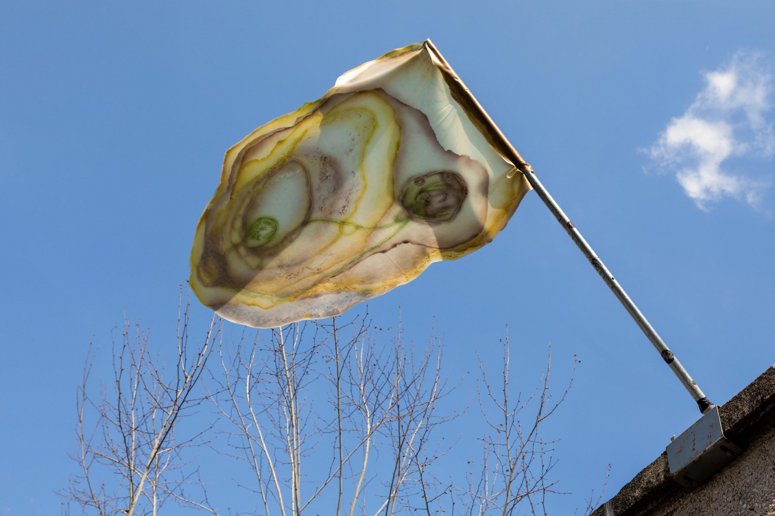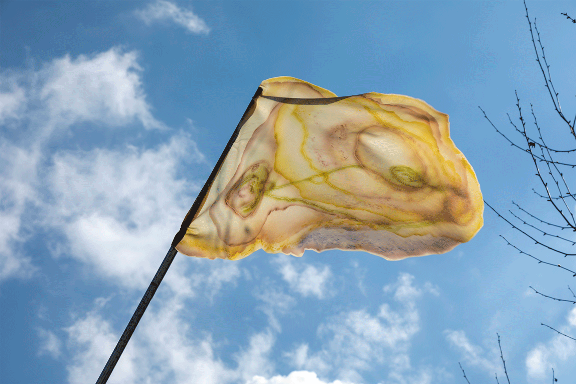 La pratique de Natália est étroitement liée au mouvement, au cinéma et à la scénographie. Son drapeau fait partie d’une série d’œuvres développées à l’origine pour la performance d’Annamaria Ajmone « Pianti e lamenti dei pesci fossili ». Peinte à l’encre acrylique, l’image qu’elle présente sur son drapeau fabriqué en caoutchouc para naturel, s’inspire des fossiles et des coupures de pierres et du monde minéral.