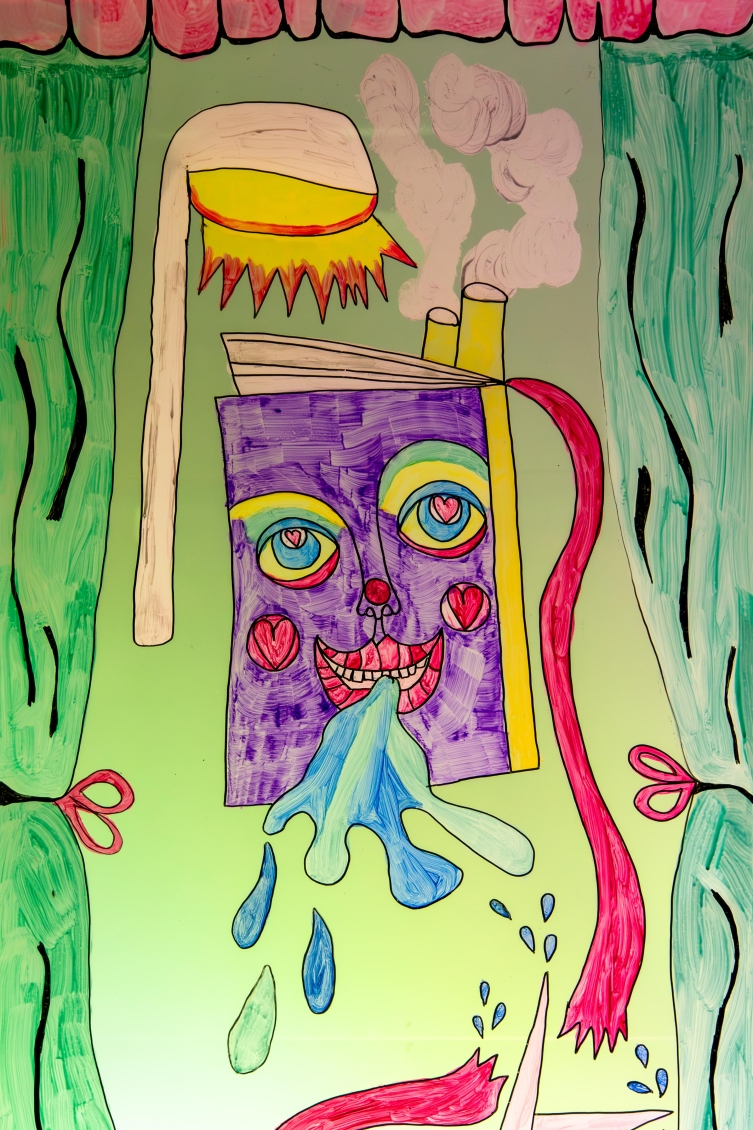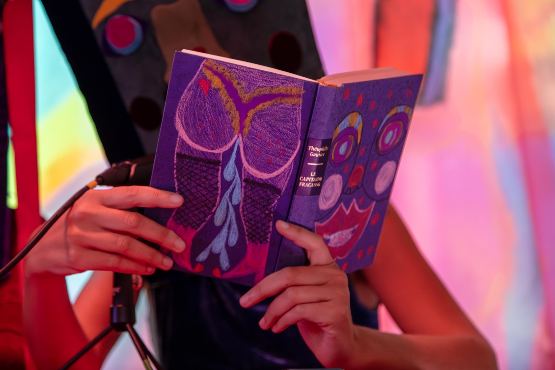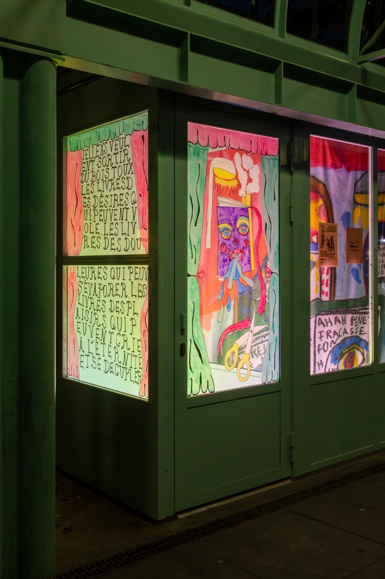 Elle met en scène trois personnagexs-livres dans un univers ruisselant et coloré. Ensemble, iellexs racontent la moite histoire d’une communauté de livre formant une bibliothèque très très très trempée; “La Grande Bibliothèque Mouillée À La Cyprine Humide”.