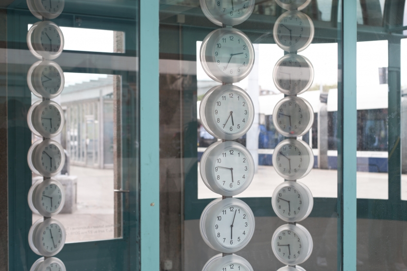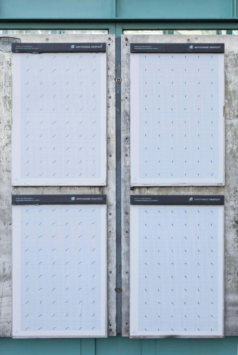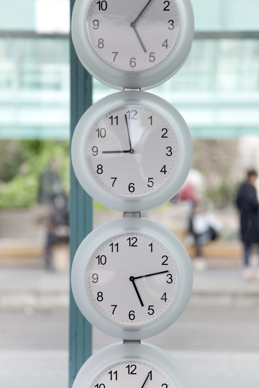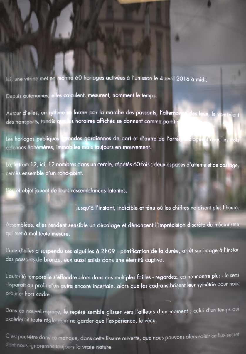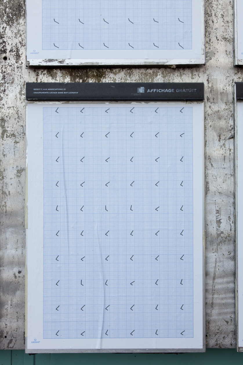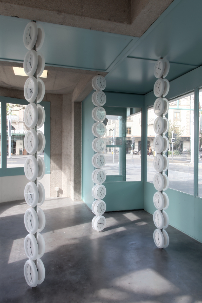 Horloges, acier, tirage offset sur papier blueback, lettrage vinyle