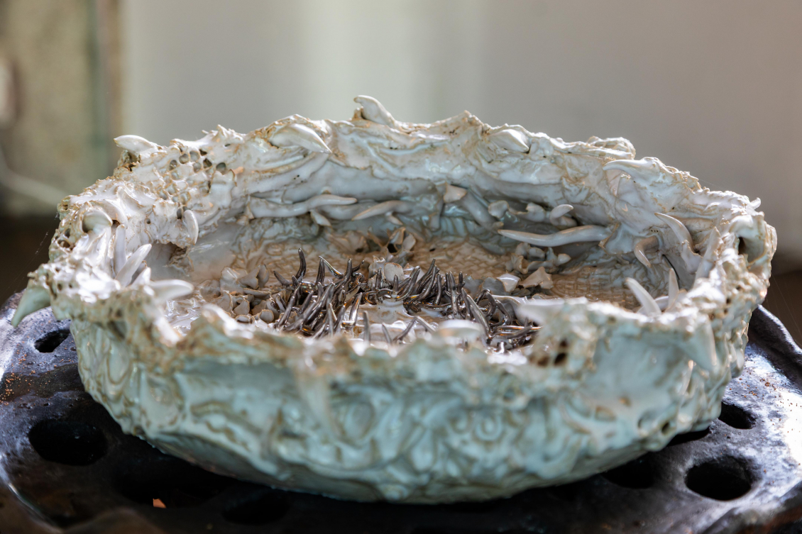 Un grognement, un vrombissement qui vient du fin fond des entrailles d’Anja me sort de mes rêveries et Plume projeté dans des centaines d’années. Disparu à l’intérieur du coeur luisant cartographié et palpitant qui menace de s’ouvrir à nouveau comme il s’ouvrira encore mille fois pour se vider de son histoire sur le sol de Zabriskie. Les céramiques d’Anja ont une vie indépendante, de ses nids poussent des oeufs protégés par leur griffes, au même instant engloutis, ravalés par l’histoire. Léchée par les flammes la terre crépite, prend forme et trouve un nouveau sens.